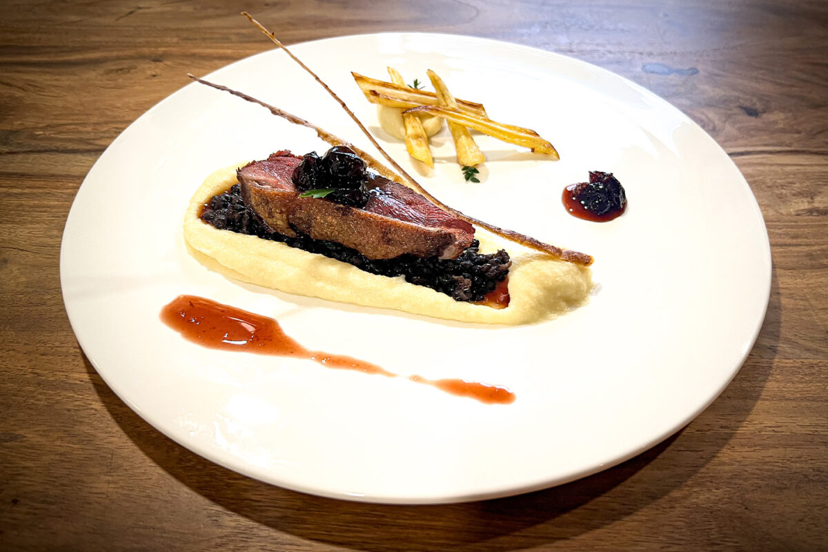 Petto d’oca sous vide con agrodolce di mirtilli selvatici e purè di piselli dolci